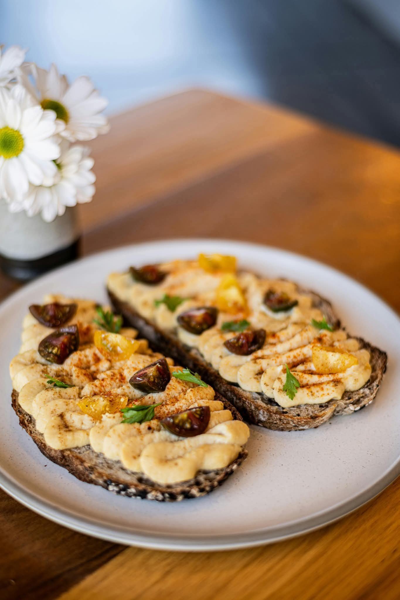 - The contrast is incredible: The crunch of the rustic sourdough against the smooth, cool hummus, topped with the warm, burst of the sliced tomatoes and a delicate spice—it’s just layers of textural goodness that make you want to go back for more.