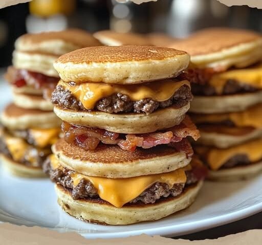 Imagine this: mini cheeseburgers, melty cheddar, rich truffle butter grilled pancakes, and smoky bacon—stacked and dripping with comfort food energy. It’s brunch and burger night had a baby.