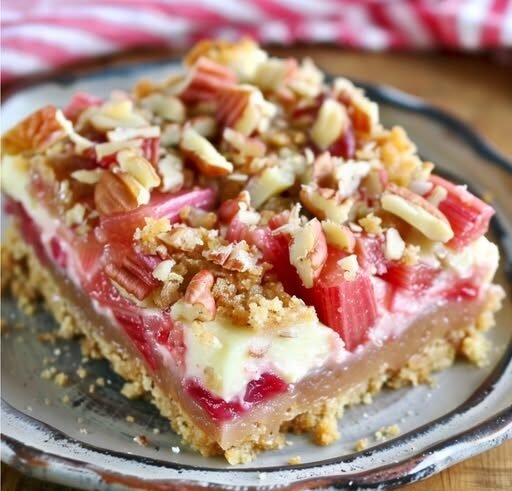 Tart rhubarb, creamy cheesecake, buttery crumble—these Rhubarb Cheesecake Bars have it all. Whether you’re baking for a spring picnic, Mother’s Day brunch, or just to celebrate rhubarb season, this dessert is an absolute winner. The tang of rhubarb is balanced by sweet strawberry gelatin, and when paired with that rich cream cheese layer and nutty pecan crumble? Magic.