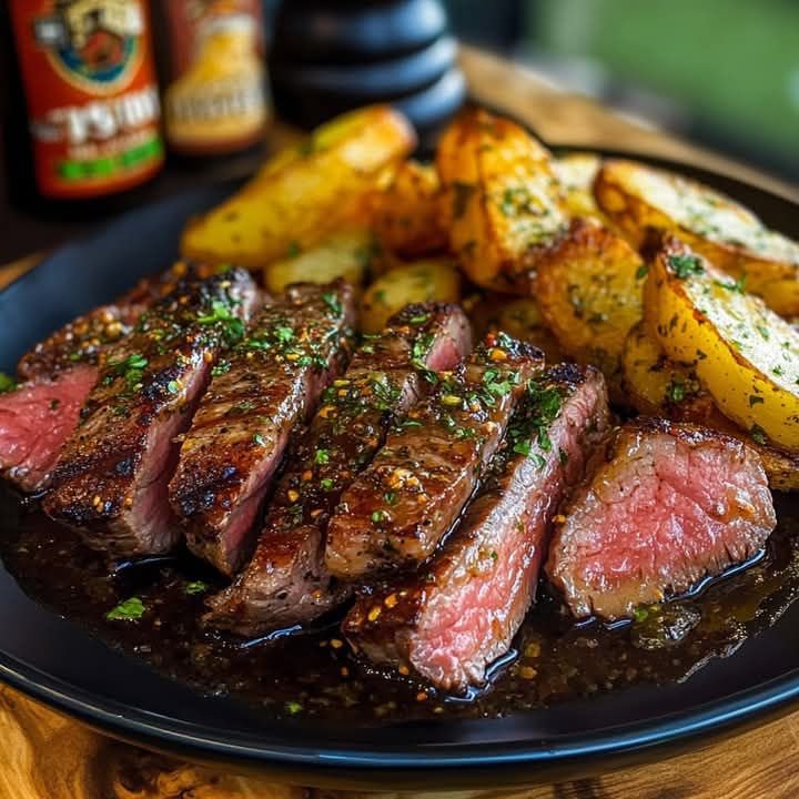 - Serve: Once the steaks have rested, slice them into thick, juicy slices against the grain. Arrange the sliced steak on a sleek black plate (or any plate you prefer for an elegant presentation). Drizzle the prepared herb glaze generously over the top of the sliced steak. Arrange the golden roasted potato wedges artfully around the steak. Garnish everything with fresh finely chopped parsley.