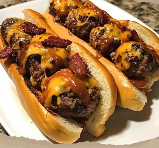 - Assemble the Subs: Spoon a generous amount of bourbon BBQ bacon cheeseburger meatballs into each toasted sub roll.