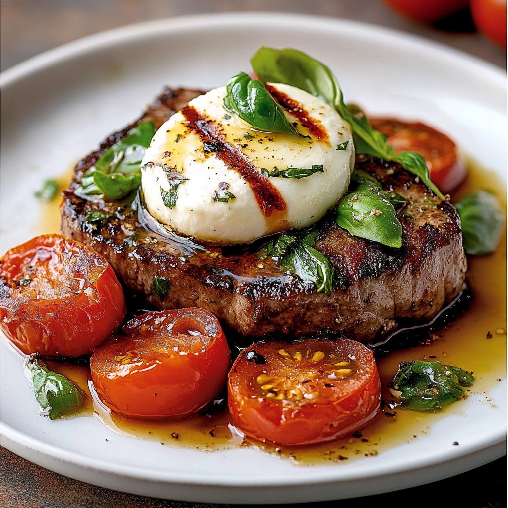 - Melt the Cheese: Return the rested steaks to the skillet. Top each steak with 2 slices of fresh mozzarella and spoon the warm tomato-balsamic mixture over the top and around the steaks.