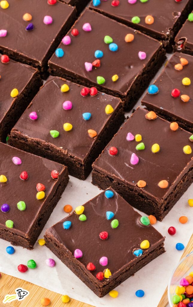 - Spread a layer of chocolate frosting over the cooled brownies and sprinkle with rainbow sprinkles.