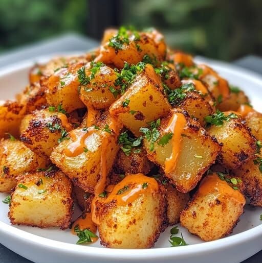 Crispy on the outside, tender on the inside, and absolutely drenched in flavor—that’s my kind of potato. The Bang Bang drizzle has that magic combination of creamy mayo, sweet chili, sriracha heat, and bright lime juice. It clings to the hot, crispy potatoes just enough to coat without making them soggy.