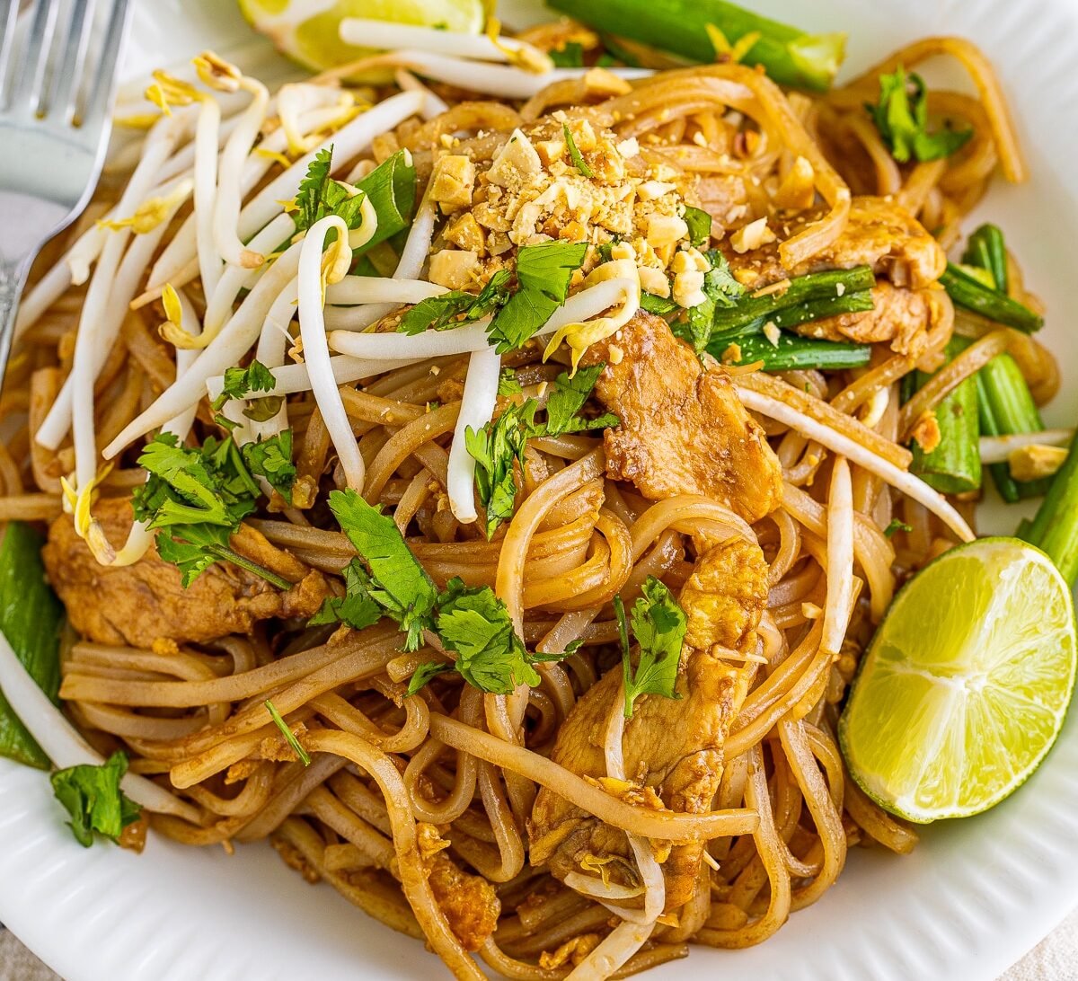 - Serve: Divide the Pad Thai among serving plates. Garnish with extra fresh bean sprouts, crushed peanuts, fresh cilantro, and a lime wedge. Serve immediately.