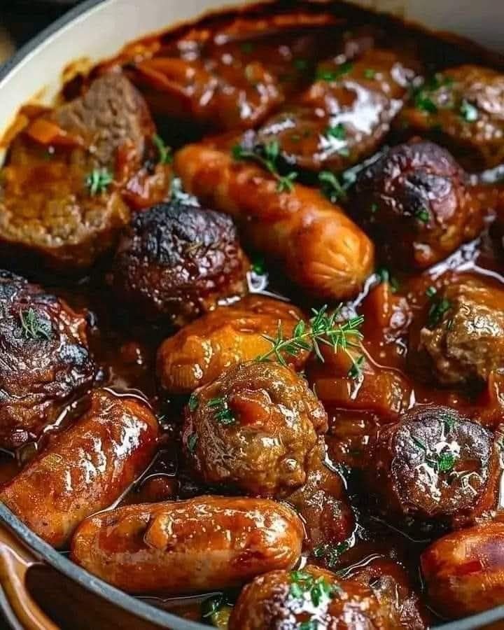 - Slow Cook the Meats: Cover the pot, reduce the heat to medium-low, and let the gravy simmer for 2−2.5 hours, stirring occasionally. Add the beef sausages to the gravy and cook for another hour, uncovered.