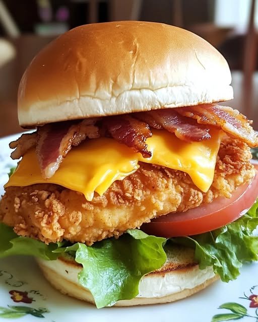 9. Assemble the Sandwich: To build your epic sandwich, spread a generous layer of the barbecue mayo on the bottom half of each toasted bun. Place a cheesy fried chicken breast on top. Add two slices of crispy bacon, followed by slices of fresh tomato and a few leaves of lettuce. Crown it with the top bun.