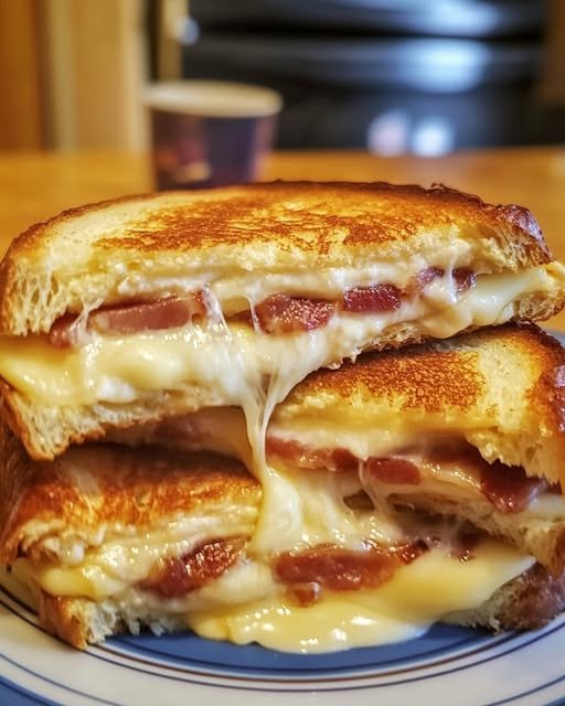 6. Serve: Once all sandwiches are cooked to perfection, transfer them to a cutting board. Cut each sandwich in half diagonally. Serve hot immediately, perhaps with a side of maple syrup or raspberry jam for dipping, or a dusting of powdered sugar. Enjoy the ultimate gooey, cheesy, bacon-filled goodness!
