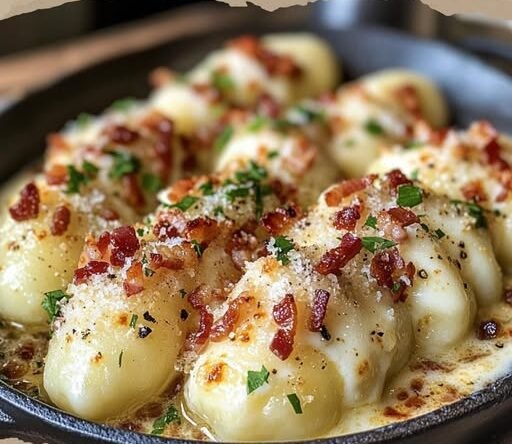 - Garnish & Serve: Carefully remove from the oven (they will be very hot!). Sprinkle with the chopped fresh parsley and any remaining crispy bacon before serving. Enjoy your delicious Bacon-Stuffed Creamy Cheese Gnocchi Boats hot!