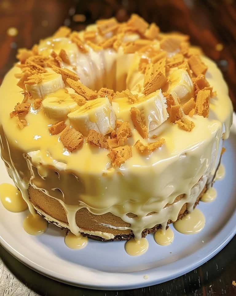 If you’re a fan of banana bread, pound cake, and banana pudding, this recipe is the ultimate mashup. It’s moist, buttery, and loaded with banana flavor, with a sweet pudding drizzle and crunchy vanilla wafers to bring everything together.