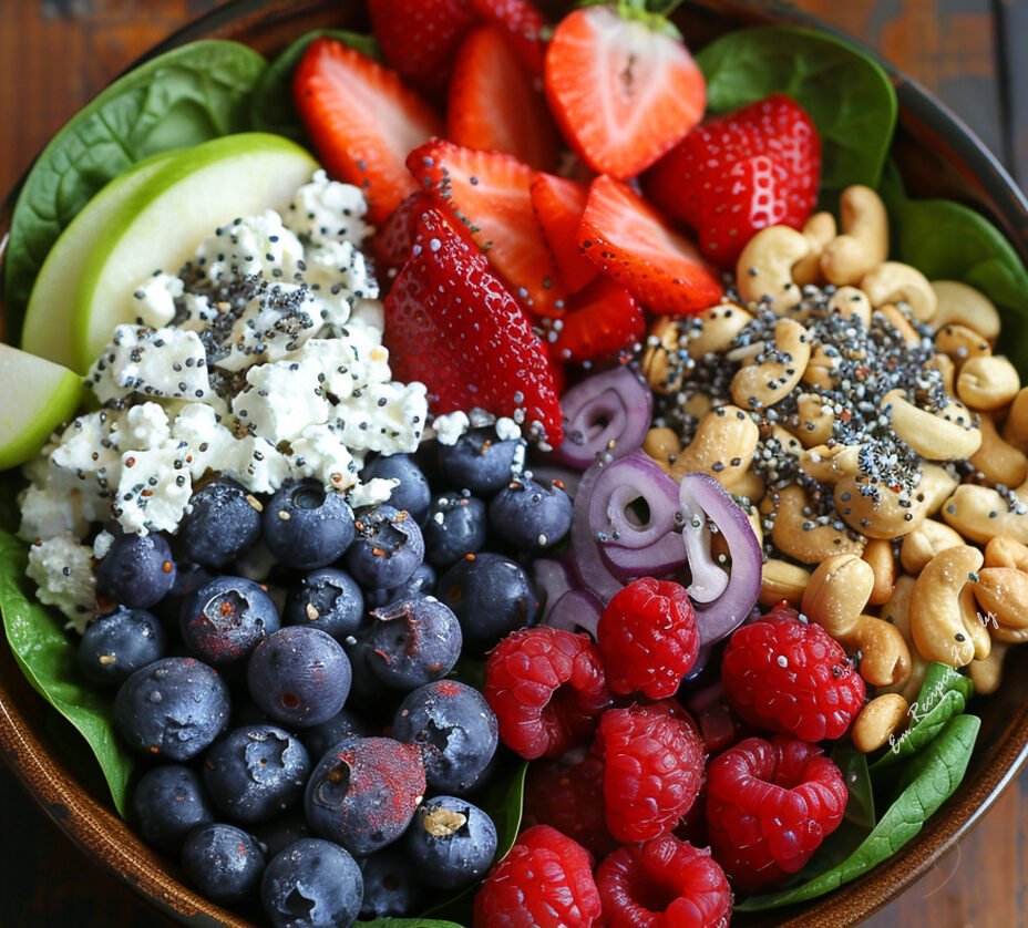 - Add Toppings: Top the spinach with the sliced strawberries, blueberries, raspberries, chopped roasted cashews, crumbled feta cheese, and chopped red onion.