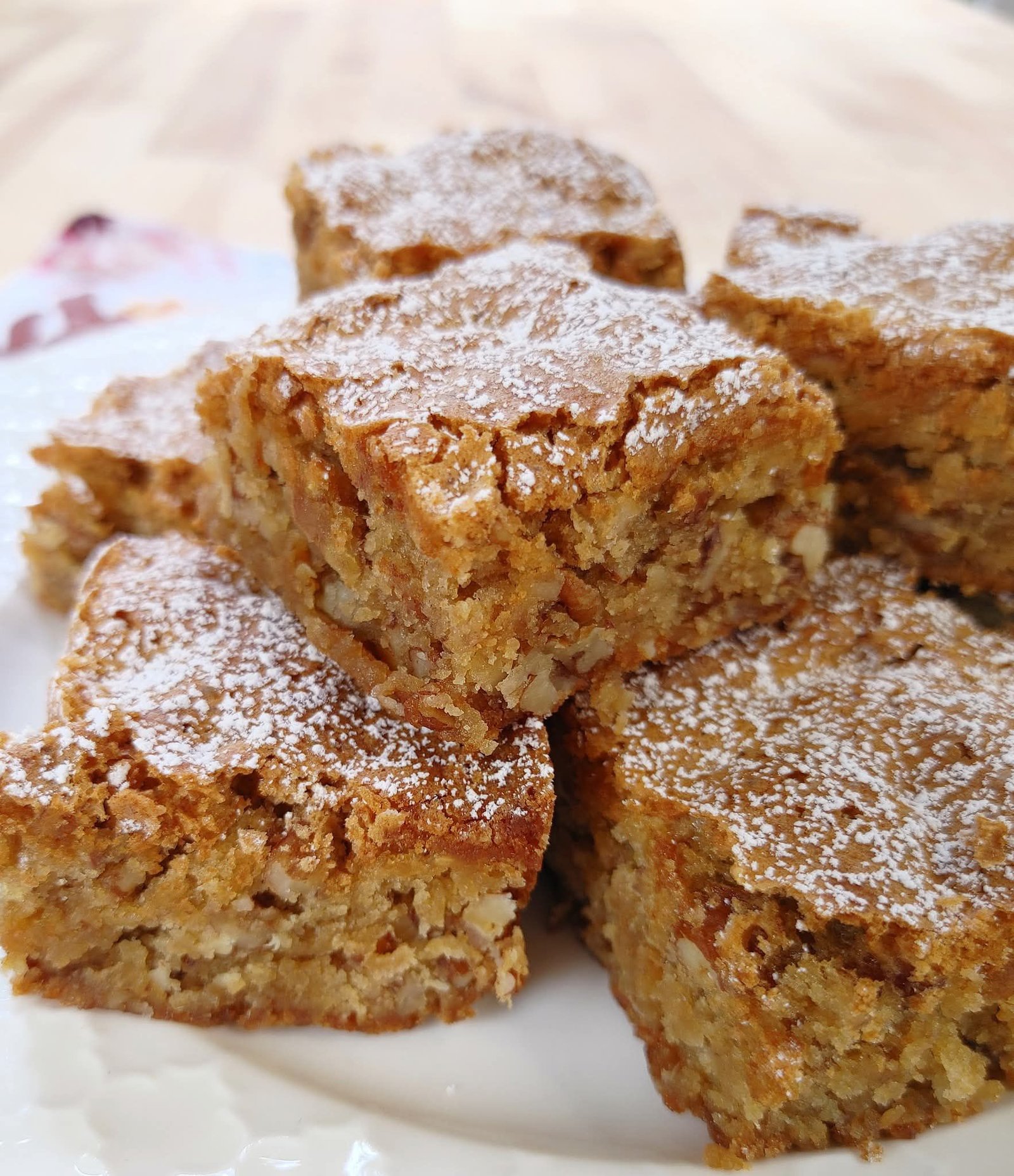 9. Slice and serve: Cut into squares and dust with powdered sugar before serving.