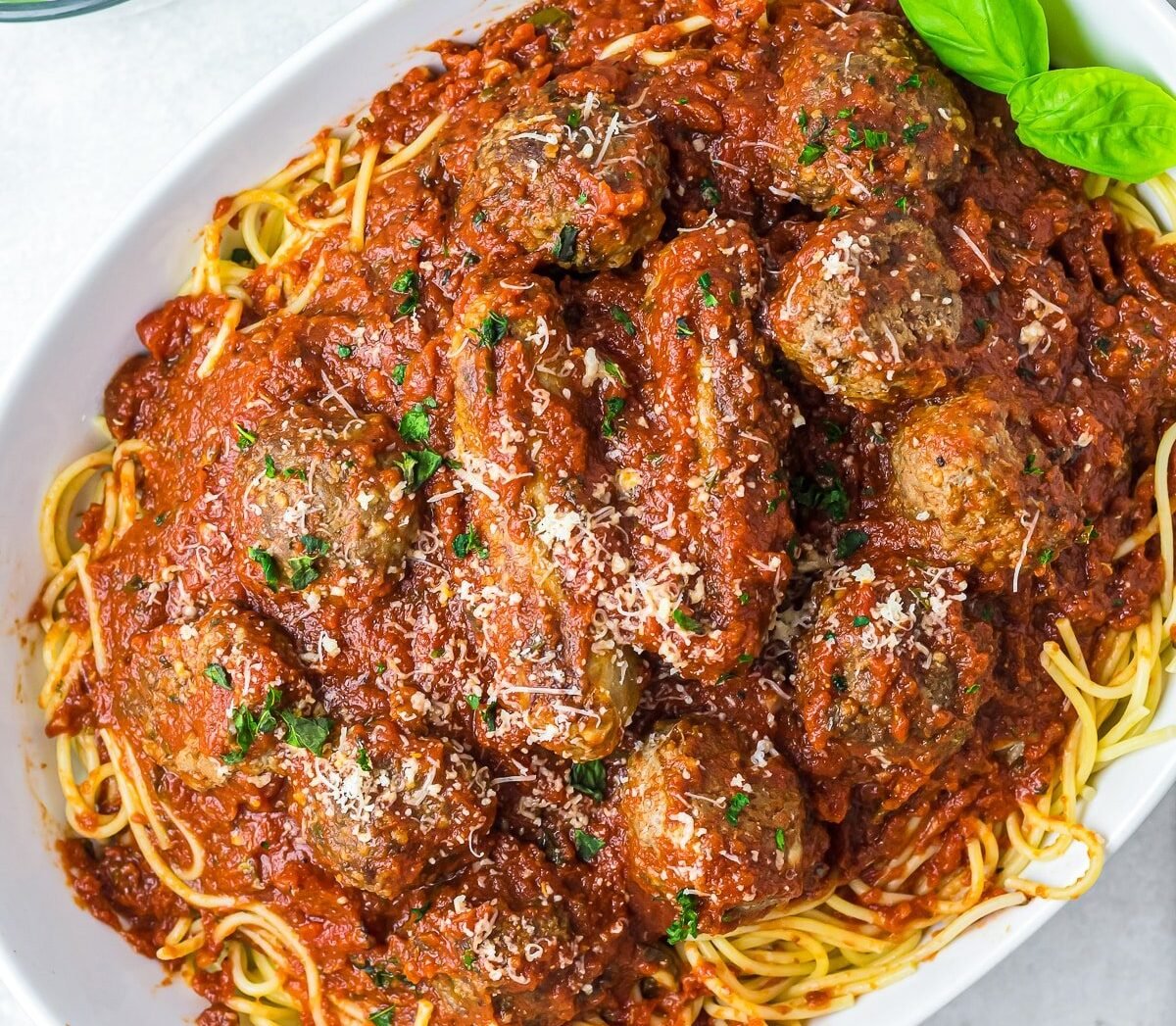 - Serve the rich spaghetti sauce generously over hot pasta, ensuring each serving gets a good mix of meatballs and sausage. Garnish with freshly chopped basil and grated Parmesan cheese.