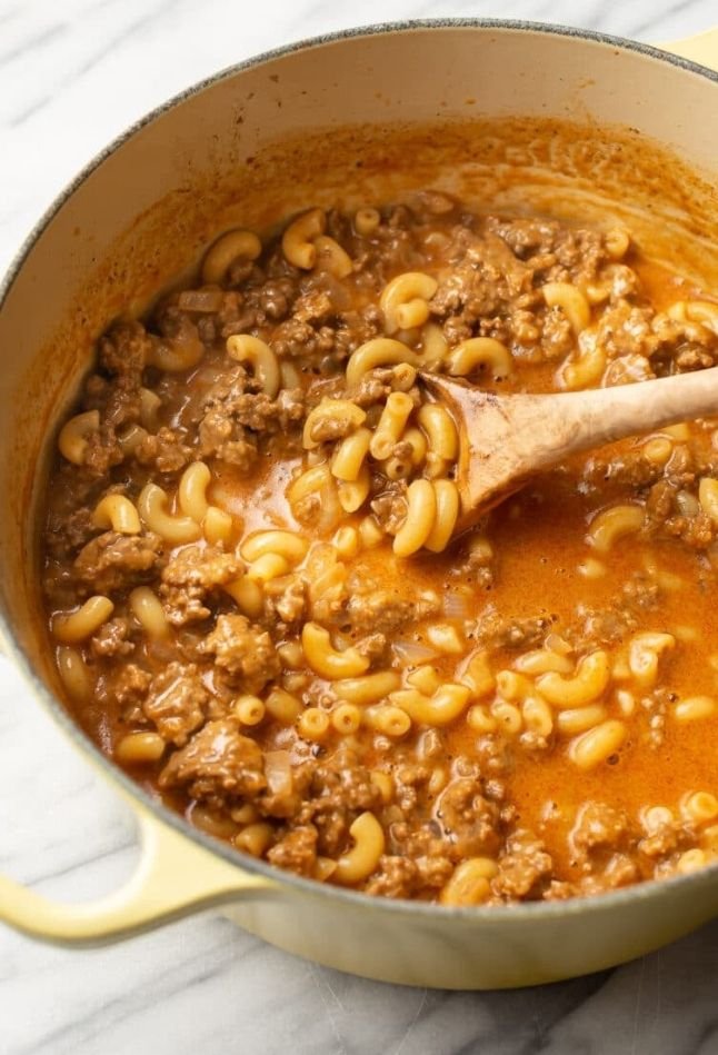 Ground beef and onions create a savory base, tomato paste and spices add richness, and the pasta cooks right in the broth so every bite is packed with flavor. Once the cheese melts in at the end, the whole pot transforms into a creamy, hearty dinner that feels both familiar and homemade in the best possible way.