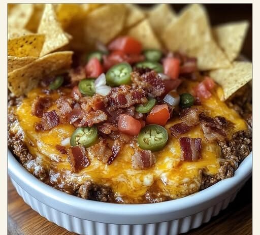 When you take everything you love about a bacon cheeseburger—juicy beef, smoky bacon, melted cheese, tangy pickles, and sweet BBQ sauce—and swirl it into a rich, creamy, slightly boozy dip, you get this absolute show-stopper: Bourbon BBQ Bacon Cheeseburger Dip. It’s smoky, cheesy, tangy, and bold with just the right kick of bourbon to keep things interesting. Perfect for game day, potlucks, or late-night cravings, this dip is pure comfort in every scoop.