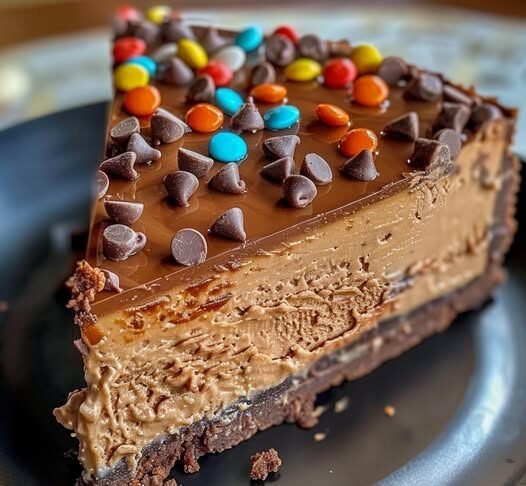 This cheesecake is everything a dessert should be—rich, creamy, chocolatey, and loaded with candy for an extra fun twist. The Oreo crust, velvety chocolate cheesecake, silky ganache, and crunchy candy toppings make it irresistible.