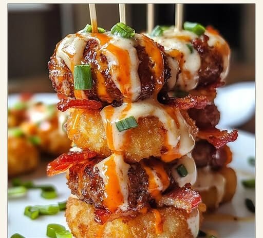 Buffalo Ranch Bacon-Wrapped Tater Tot Meatball Stacks are more than just a mouthful to say—they’re a mouthful of flavor. From the spicy, juicy meatballs to the crispy bacon and golden tater tots, every bite delivers on comfort, crunch, and craveable heat. Whether you serve them stacked high at your next party or pile them up for a cozy dinner, these bites bring the fun and the flavor.