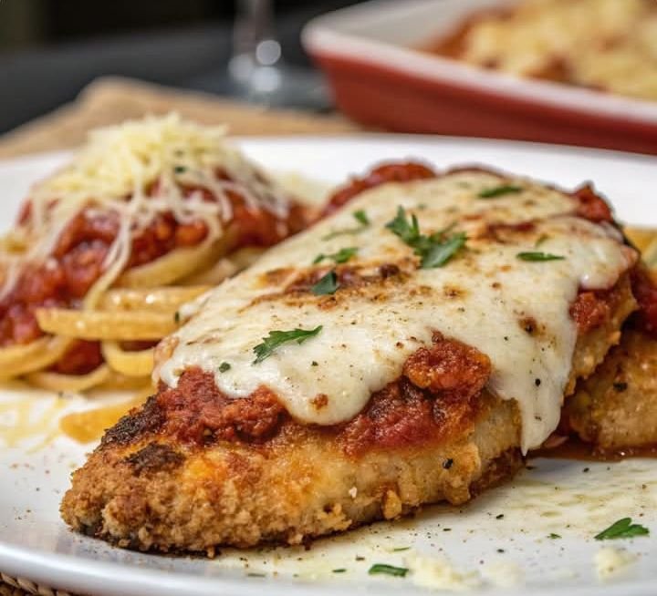Chicken Parmesan is especially good with spaghetti, fettuccine, buttered noodles, garlic bread, roasted broccoli, or a crisp green salad. It can lean hearty and classic with pasta, or lighter with vegetables and salad on the side.