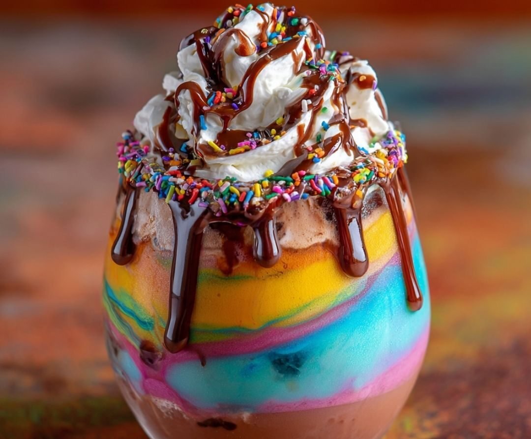 Top the drink generously with a swirl of whipped cream. Drizzle the top with chocolate syrup and finish with a liberal shower of rainbow sprinkles. Serve immediately and watch the magic happen!