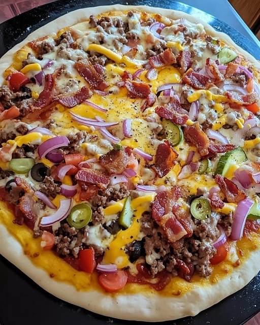 - Assemble Toppings: Spread the cooked ground beef evenly over the mozzarella cheese. Then, scatter the crumbled bacon, diced red onion, diced green bell pepper, sliced mushrooms, sliced black olives, diced tomatoes, and chopped pickles over the beef and cheese.