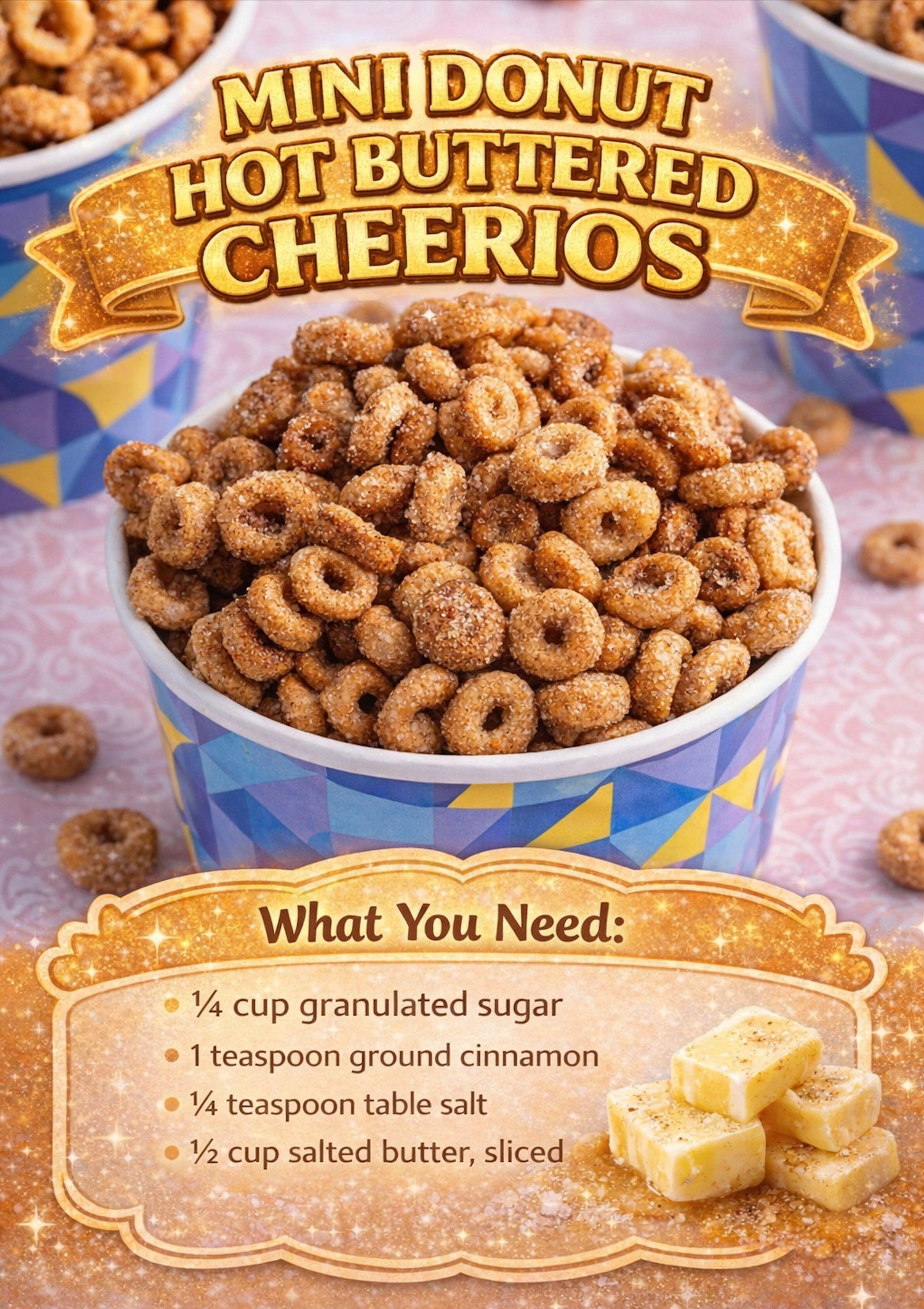 In a small bowl, whisk together the granulated sugar, ground cinnamon, and salt. Mixing this beforehand ensures that every Cheerio gets an even distribution of spice rather than clumps of cinnamon in one spot.