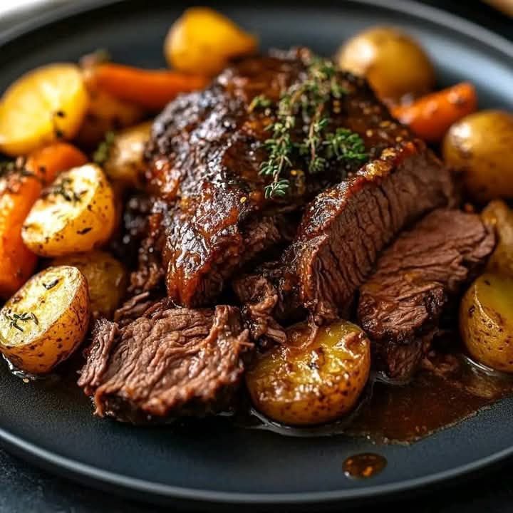 Classic Slow-Cooked Pot Roast with Glazed Baby Potatoes and Carrots