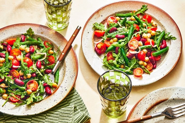 - Add the green beans, kidney beans, chickpeas, red onion, and bell pepper to the bowl. Toss to coat the vegetables in the dressing.