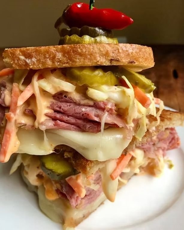 This is the kind of sandwich that feels like a full event rather than a quick lunch. The corned beef braises low and slow until fork-tender, then gets sliced thin and piled high onto rye or pumpernickel. Add the grilled bread, warm cheese, crunchy slaw, and a little extra sauce, and you get a sandwich that is rich, tangy, spicy, and deeply satisfying.