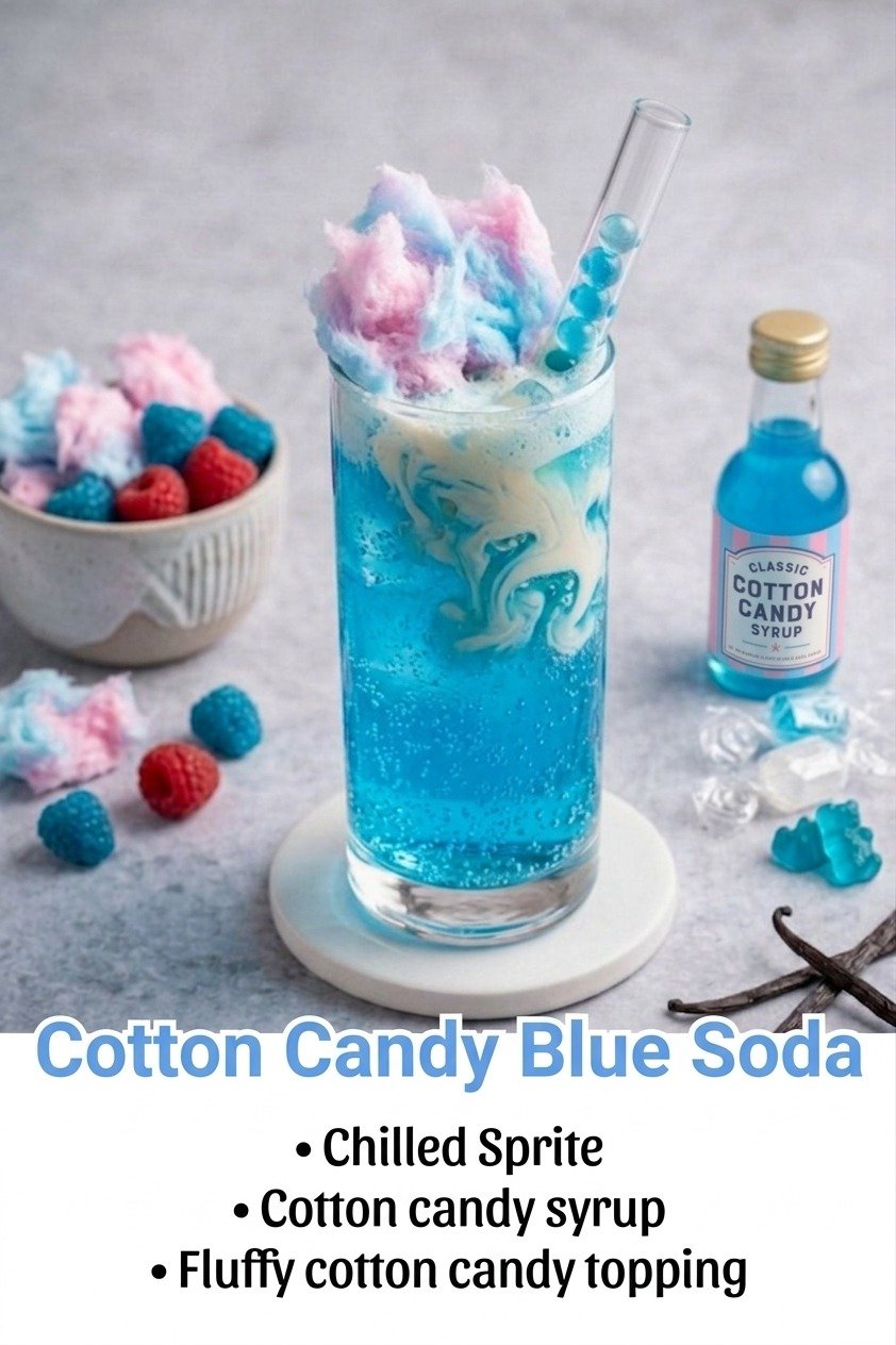 Sprite is a great choice because its lemon-lime flavor keeps the drink bright and refreshing, but any clear lemon-lime soda works well here. If you want the strongest visual effect, use a vivid blue cotton candy syrup and serve the drink in a clear glass so the layered look really stands out.