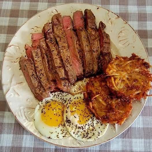 • Plate the sliced steak next to the hash browns and top with sunny side up eggs