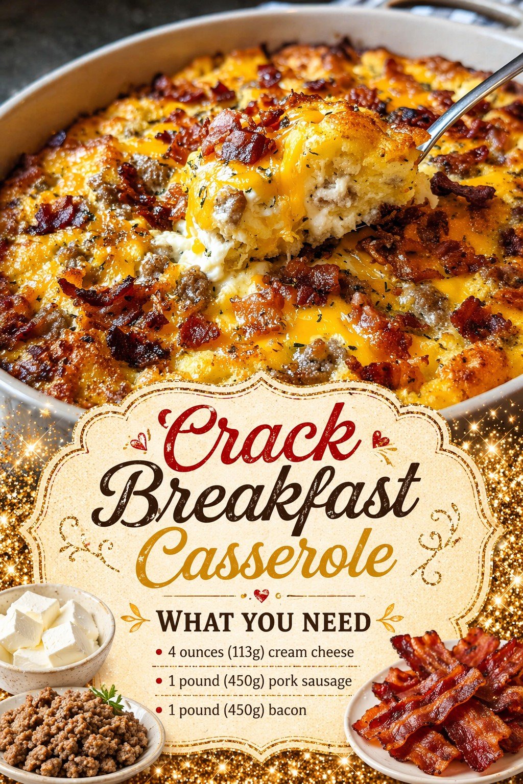 When a breakfast recipe manages to be rich, hearty, make-ahead friendly, and easy to serve to a crowd, it earns a permanent place in the rotation. That is exactly what makes Crack Breakfast Casserole so appealing. The source recipe combines pork sausage, bacon, cream cheese, sour cream, milk, eggs, cheddar cheese, hash browns, and ranch seasoning into one baked casserole that is sliced and served warm. It is designed for a 9×13-inch pan, yields 8 servings, and takes about 75 minutes total.