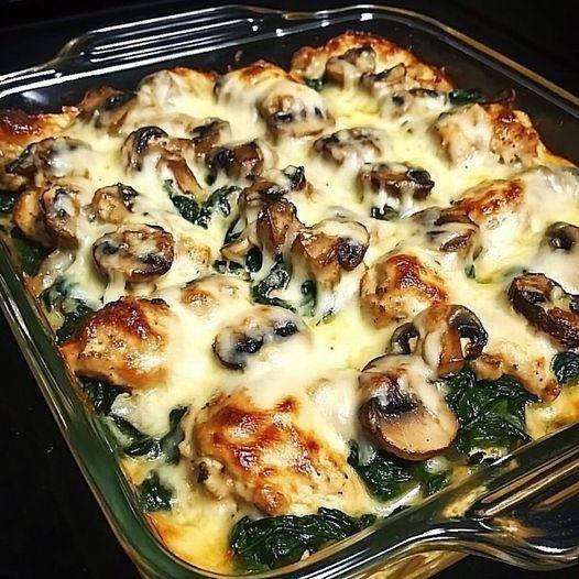 I preheat the oven to 375°F (190°C) and grab a 9×13-inch baking dish. I lay the chicken breasts in a single layer across the bottom. Then I scatter the spinach over the chicken, followed by the sliced mushrooms.