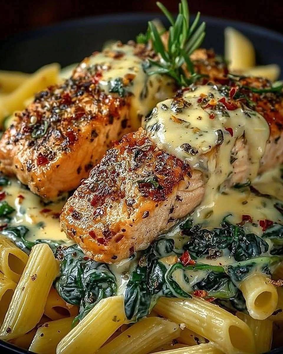 Imagine perfectly seared, flaky salmon nestled atop a bed of tender penne pasta, all bathed in a rich, creamy garlic sauce infused with sun-dried tomatoes and vibrant spinach. This Tuscan Salmon with Creamy Garlic Penne brings the warmth and flavors of Italy right into your kitchen. It’s a bold, elegant, and deeply satisfying dish that’s surprisingly quick to prepare, making it ideal for a weeknight family dinner or a special date night in. Get ready for a delicious journey to Tuscany with every single bite!