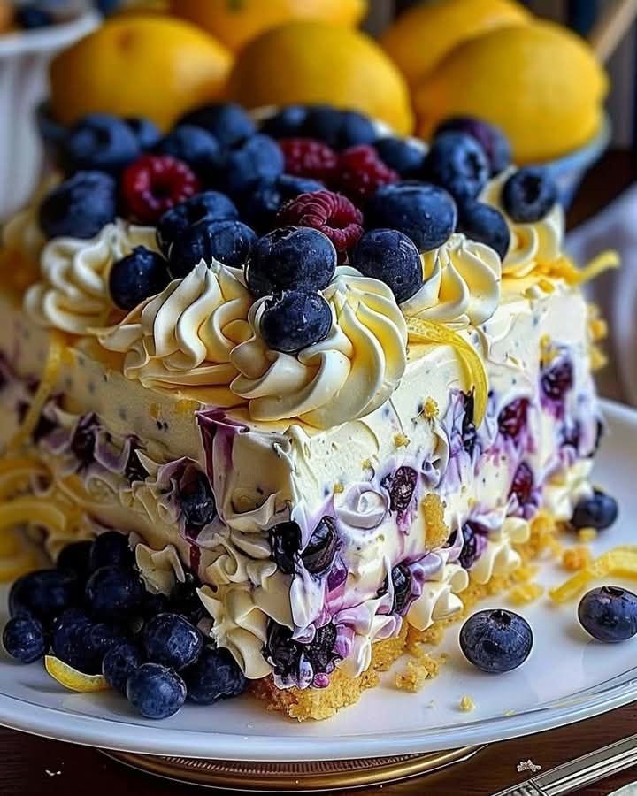 This No-Bake Lemon Dazzling Blueberry Cream Cake is a true celebration of fresh flavors and simple preparation. It proves that you don’t need to turn on your oven to create a dessert that’s both elegant and incredibly delicious. Whether you’re making it for a special occasion or just because you crave something sweet and refreshing, this cake is sure to become a new favorite.