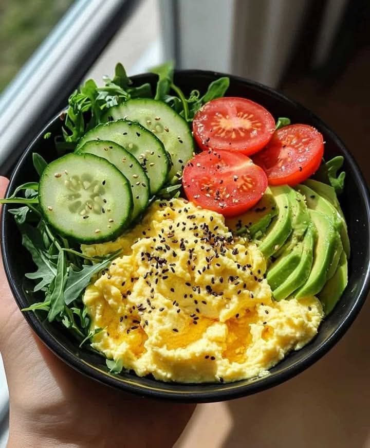 3. Assemble the Bowl: Arrange the fluffy scrambled eggs, the sliced avocado, tomato, and cucumber in a bowl. Add a handful of fresh spinach and arugula. If you’re using it, add a dollop of hummus.