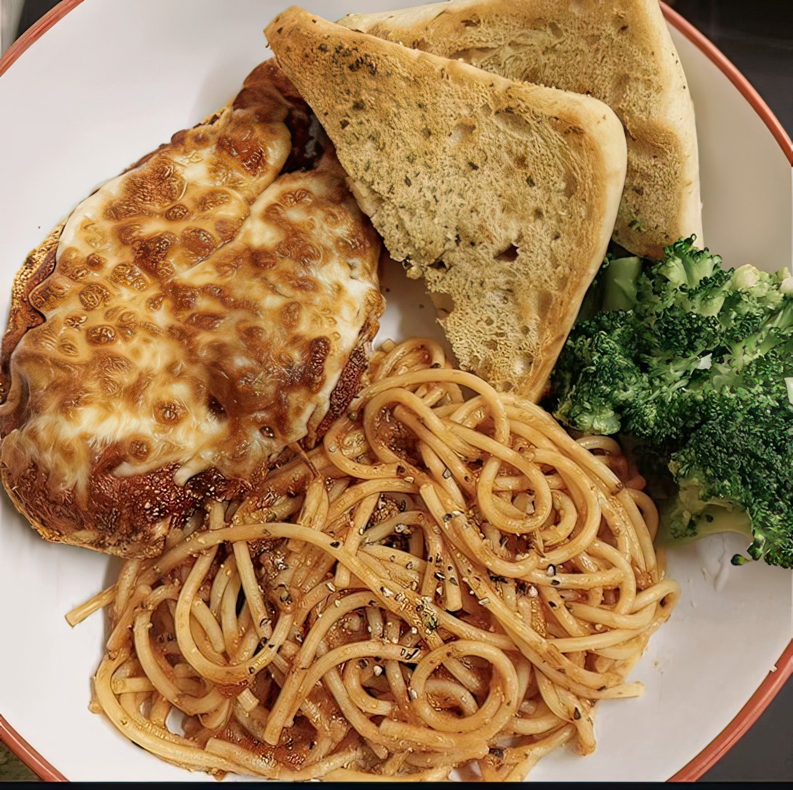 • Carefully plate the cooked Chicken Parmesan. Serve it alongside a generous portion of the sauced spaghetti, two slices of warm garlic bread, and the vibrant steamed broccoli. Enjoy your classic, comforting meal!