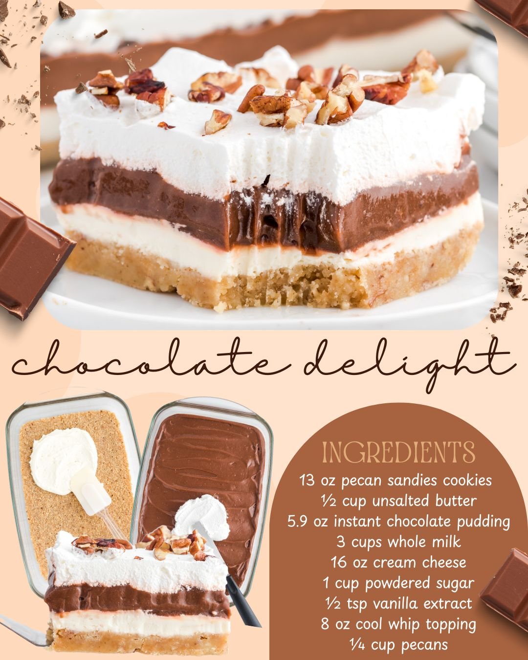 Chocolate delight is one of those classic recipes that brings comfort and indulgence to any gathering. The layers of buttery pecan crust, smooth cream cheese filling, rich chocolate pudding, and fluffy whipped topping create a dessert that’s as beautiful as it is delicious. Whether you’re serving it at a family dinner, potluck, or holiday celebration, it’s guaranteed to be the first dish to disappear.