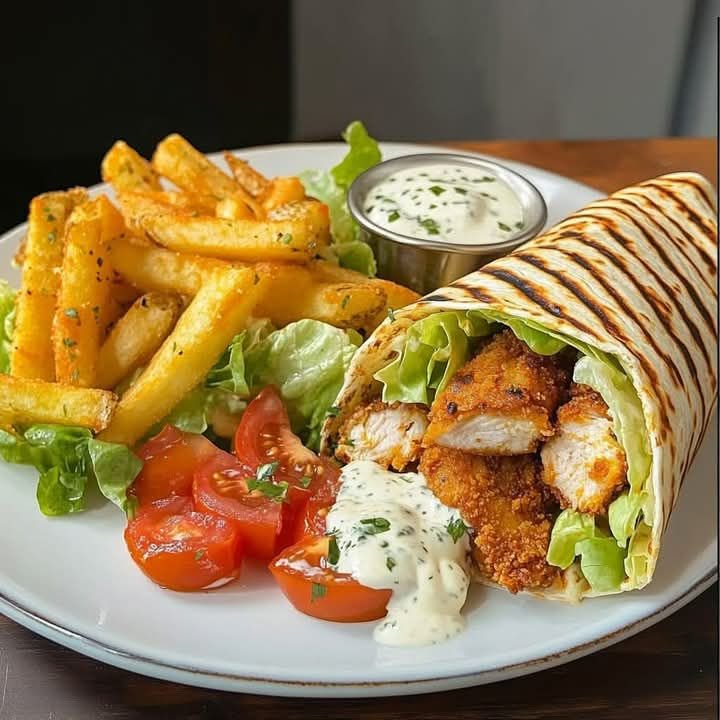 Sometimes, you crave a meal that’s both hearty and fresh, comforting yet balanced. This Crispy Chicken Wrap with Wedges & Fresh Salad is exactly that! It’s a complete meal experience, featuring golden, crunchy chicken strips, gooey melted cheese, crisp lettuce, and a tangy ranch dressing, all snugly wrapped in a warm tortilla. Served alongside perfectly seasoned crispy potato wedges and a vibrant, refreshing salad, it’s a dish that truly hits every note. It’s perfect for a satisfying weeknight dinner or a fun, casual lunch.