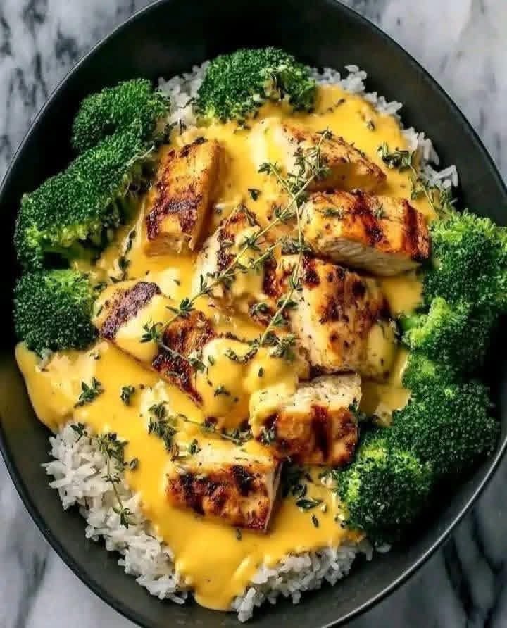 - Assemble: Divide the rice among four bowls. Top with sliced grilled chicken and broccoli. Pour a generous amount of cheese sauce over the top and garnish with fresh herbs.