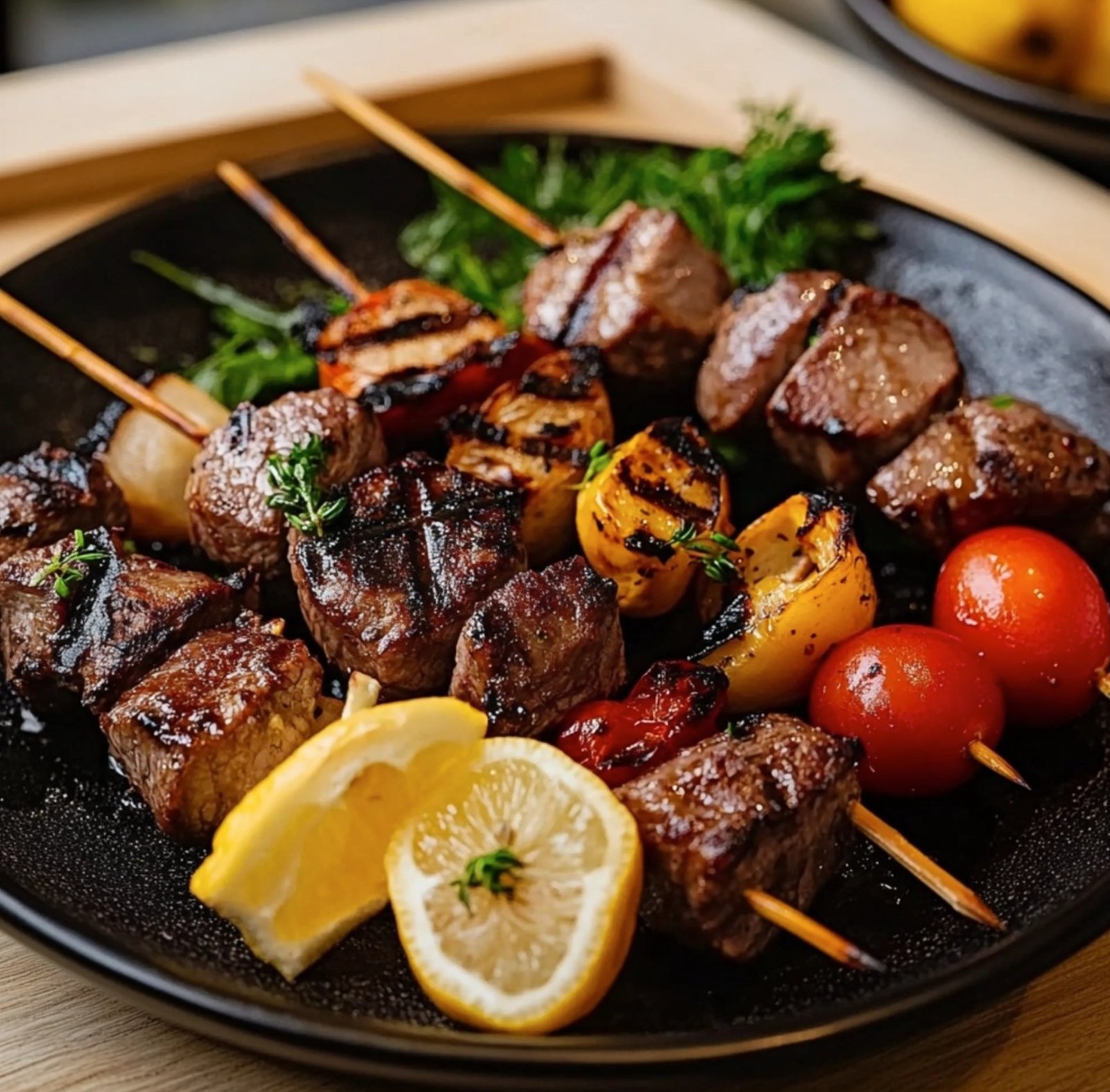 Grilled Meat Skewers with Vegetables and Lemon Garnishes 🍢