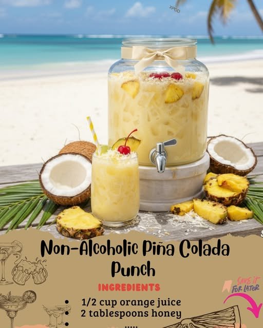 There is something instantly cheerful about a tropical drink, and this Non-Alcoholic Piña Colada Punch brings all the beachy flavor without any alcohol. With sweet pineapple juice, creamy coconut milk, bright orange juice, and crushed ice blended into a frothy, refreshing drink, this recipe is perfect for parties, brunches, baby showers, cookouts, or simply cooling down on a warm afternoon.
