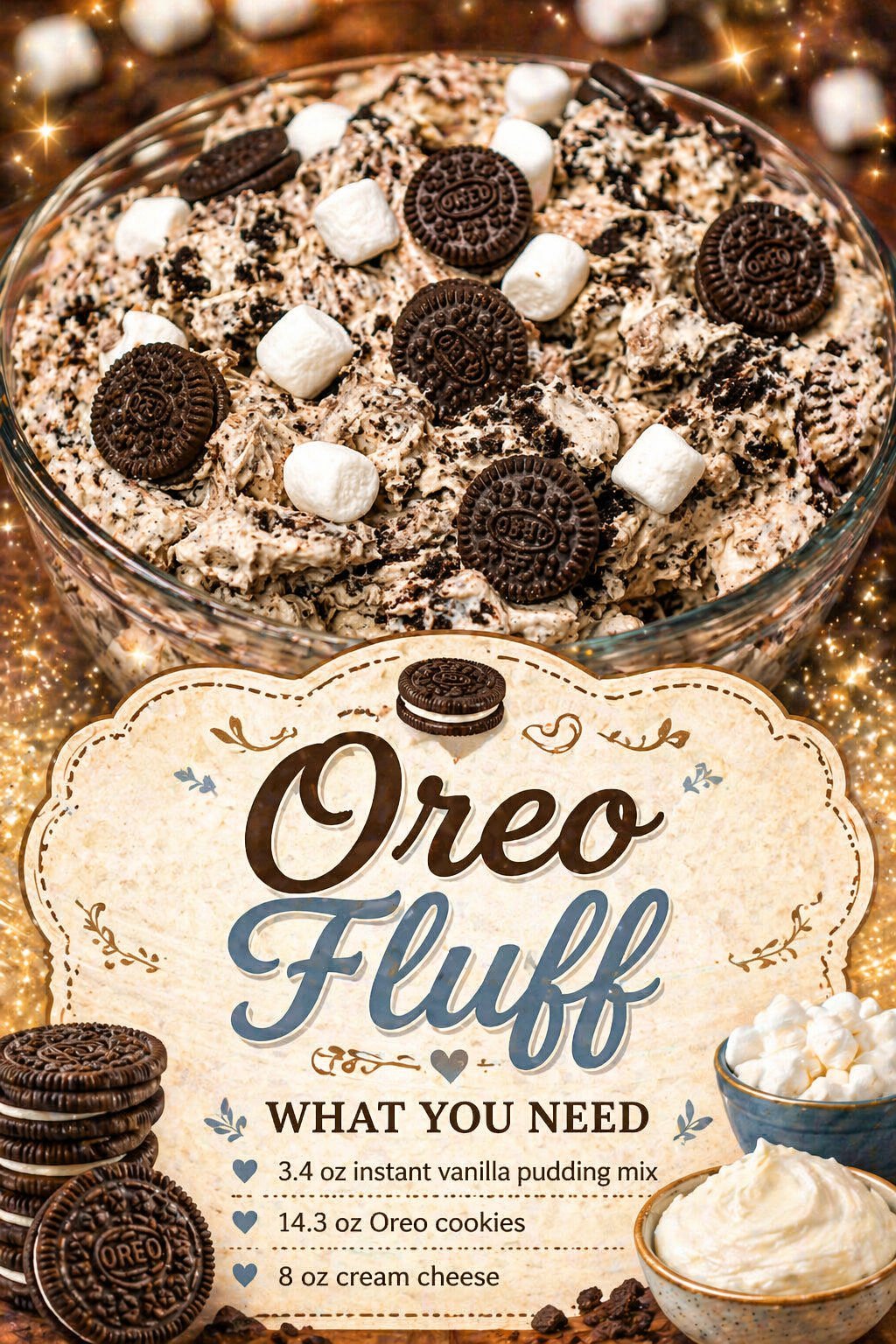 Oreo fluff is perfect on its own, but it is also fun served in individual cups for parties or layered into dessert jars for a more polished presentation. You can top it with whipped cream, extra cookie crumbs, mini chocolate chips, or even a cherry if you want to dress it up.