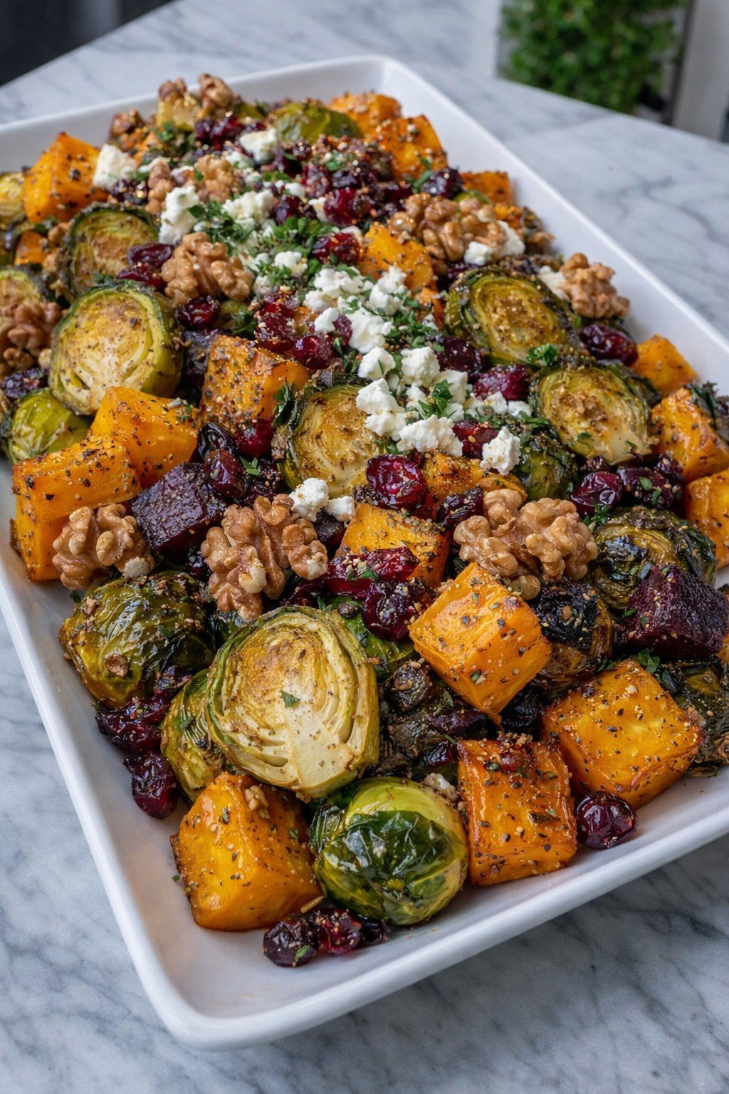 In this recipe, we are combining earthy beets, nutty Brussels sprouts, and sweet butternut squash. To take it from “standard side dish” to “showstopper,” we finish it with a tangy balsamic glaze, crunchy toasted walnuts, and creamy feta cheese. It’s the perfect balance of textures and flavors that brightens up any dinner table.