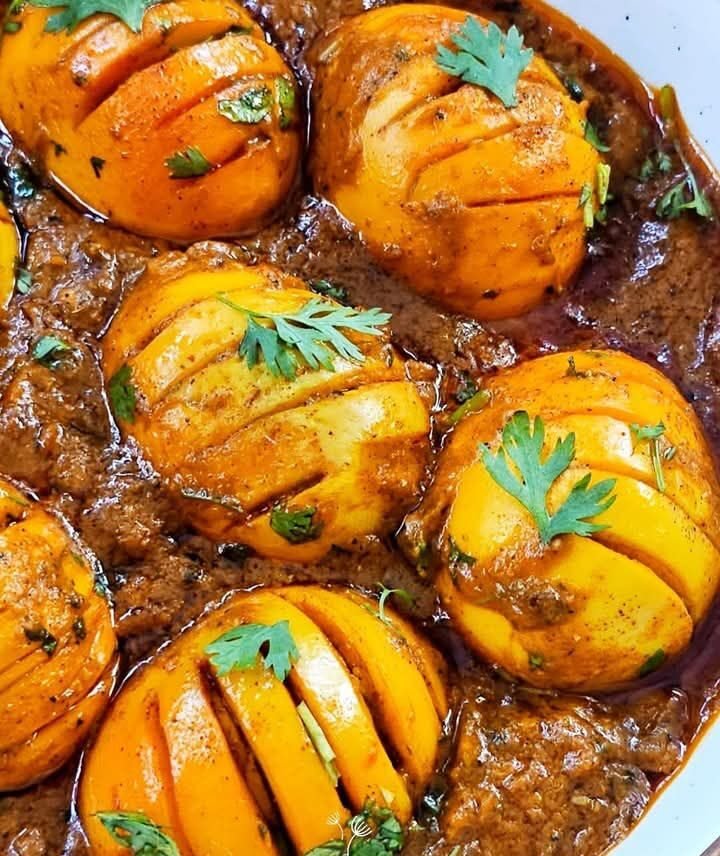 - Fry Boiled Eggs: Carefully add the 8 boiled eggs (peeled) to the pan. Fry for 2–3 minutes until they are light golden brown on all sides and coated in the spices. Remove and set aside.