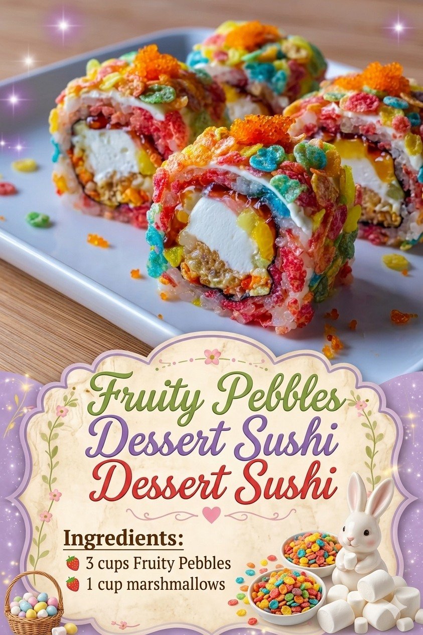 If you’re looking for a dessert that’s colorful, playful, and guaranteed to make people smile, Fruity Pebbles Sushi is it. These bright cereal rolls look like sushi but taste like gooey marshmallow cereal bars with a sweet surprise in the center.