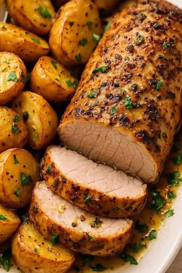 Garlic Herb Pork Tenderloin with Roasted Potatoes – Juicy, Golden & One-Pan Easy