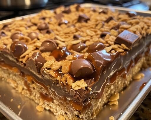 What makes these bars so irresistible is the layered contrast: a sweet and slightly salty caramel center, surrounded by a crumbly graham cracker base and a crispy chocolate topping laced with cereal crunch. Best of all? It’s a no-bake dessert, making it ideal for summer days when you want something decadent without heating up the oven.