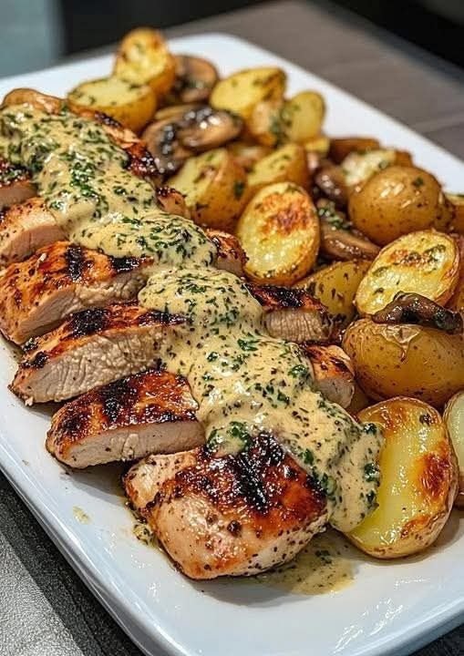 4. Assemble & Serve: Arrange the hot, honey-roasted potatoes beautifully on individual plates or in a serving bowl. Top the potatoes with the tender, garlic-herb grilled chicken slices. Finally, drizzle generously with the creamy truffle-infused mushroom basil pesto over both the chicken and potatoes. A truly special and flavorful meal!