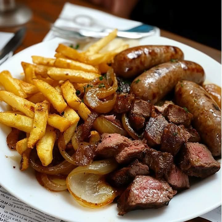 Some meals are built for the spotlight—and this one doesn’t shy away. When I’m craving something hearty, rustic, and straight-up satisfying, I turn to this Grilled Beef & Sausage with Caramelized Onions and French Fries. It’s got all the textures and bold flavors I love: juicy grilled meat, tender golden onions, and crispy hand-cut fries piled high. The kind of dish that hits the table and makes everyone stop and smile.