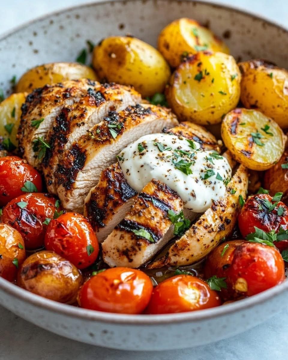 There is a special kind of meal that manages to be both incredibly delicious and wonderfully healthy. This recipe for Grilled Garlic Herb Chicken with Roasted Potatoes and Burst Tomatoes is the epitome of that feeling. It’s a beautifully balanced plate, bringing together a juicy, herb-marinated chicken, crispy, savory roasted potatoes, and sweet, tender cherry tomatoes. With a zesty, creamy dipping sauce to tie it all together, this is a complete meal that feels light and fresh, yet is hearty and satisfying enough for a perfect dinner.